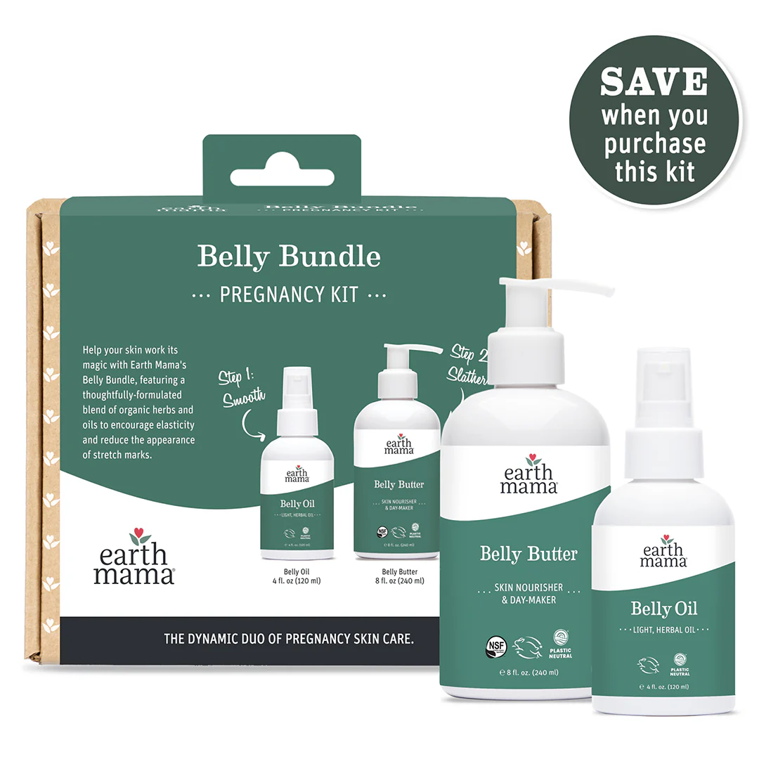 Help your skin work its magic with Earth Mama's Belly Bundle Pregnancy Kit, features Belly Butter and Belly Oil, two thoughtfully-formulated blends of organic herbs and oils to encourage elasticity and reduce the appearance of stretch marks. The perfect pregnancy pairing for your growing belly, breasts and hips, this pregnancy skin care duo will leave your skin feeling soft, smooth and hydrated, with a lovely, delicate scent that won't aggravate morning sickness. Take that, pregnancy hormones!